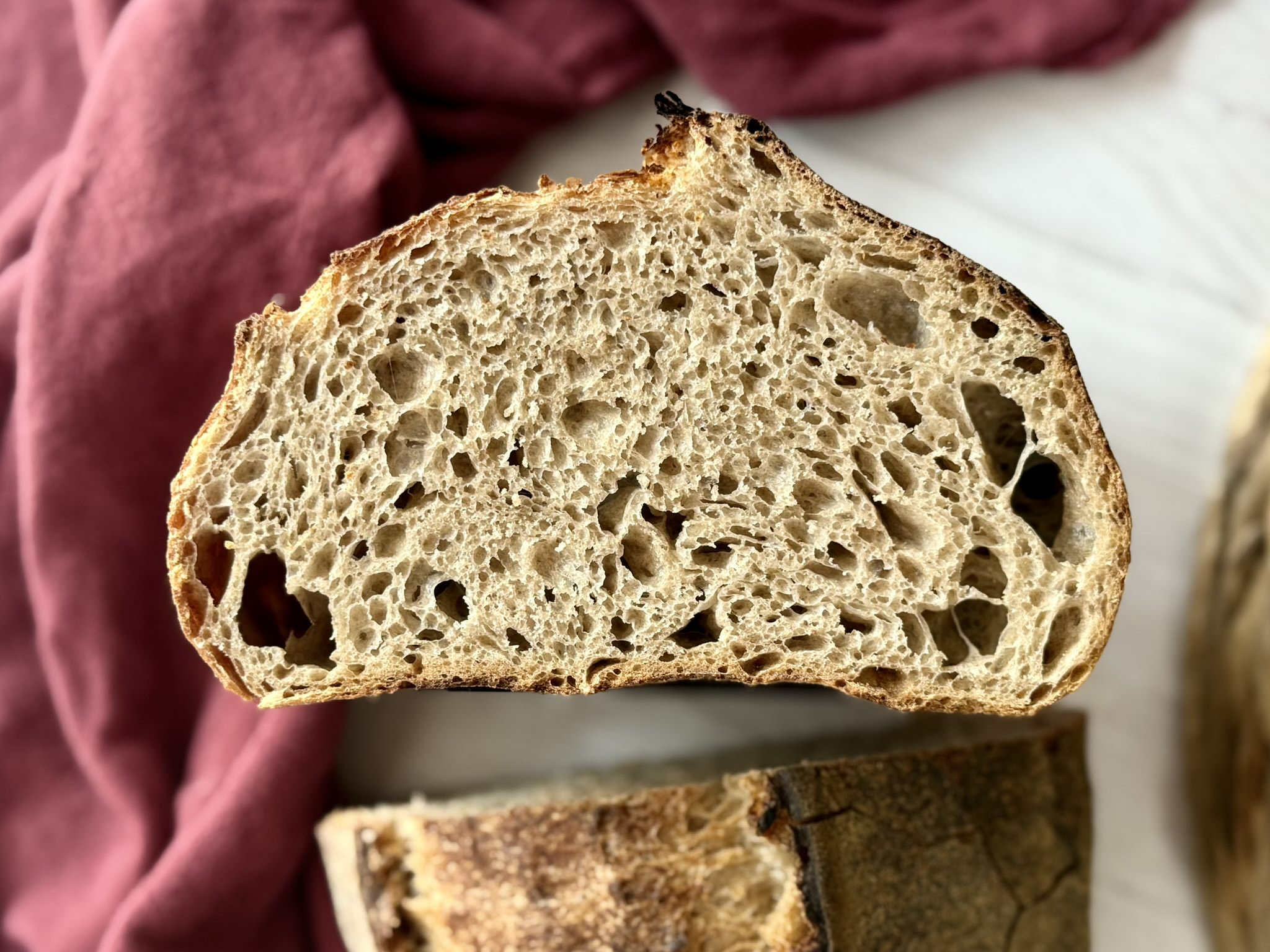 This means that you’ll likely notice the dough feels nice and stretchy during folds, but it can tear more easily if handled too roughly. Visual tearing means the gluten network literally just snapped, which causes the dough to lose gas (leading to denser bread). To avoid this, it’s important to handle the dough gently and monitor fermentation closely to avoid overstretching or overproofing (if you want great results, that is).