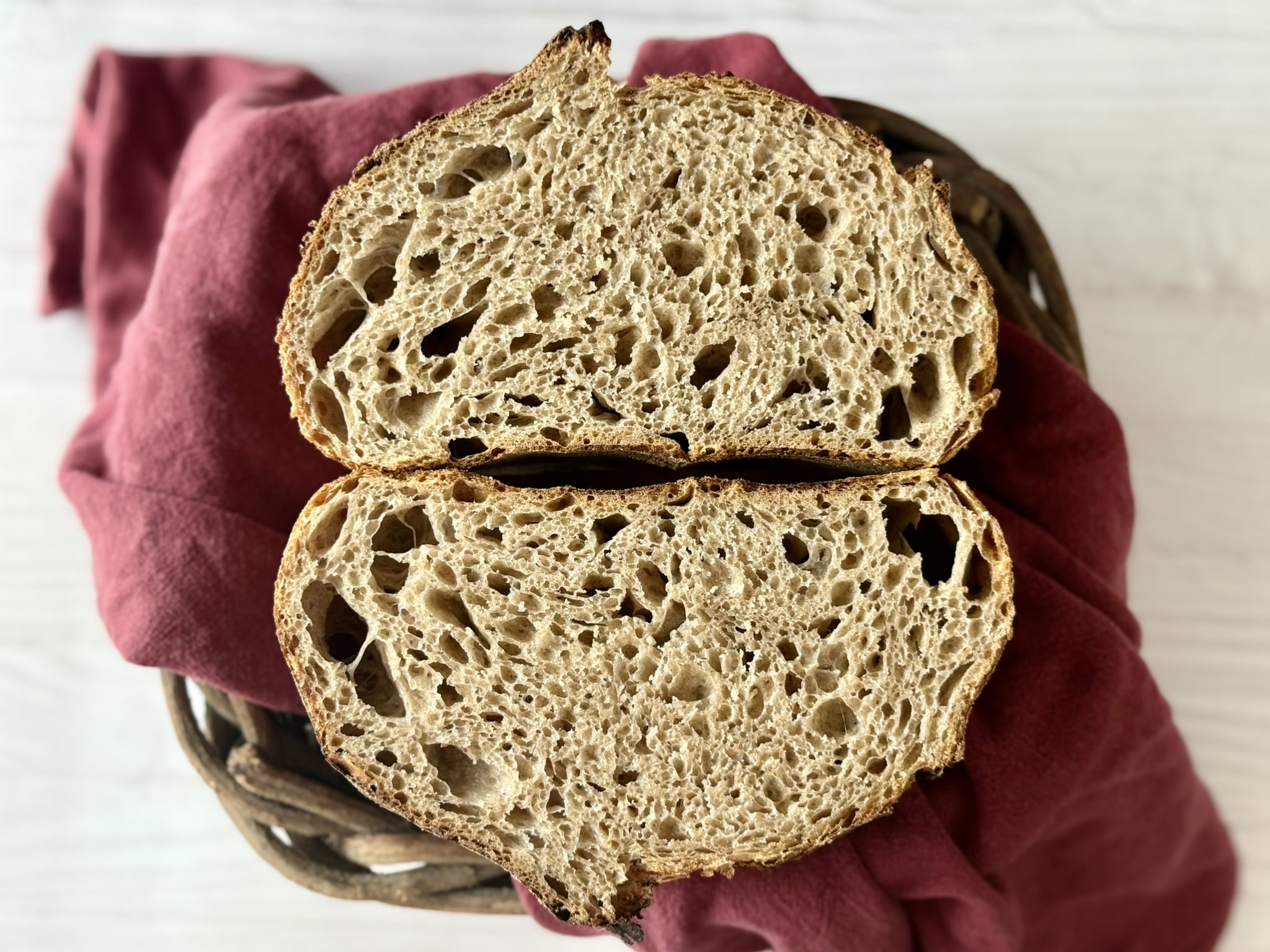 1. Whole grains absorb more water. This recipe has a higher hydration to account for that. I’ve adjusted the water amount so the dough has a similar consistency to my standard recipes, without adding so much water that it weakens the gluten structure. The premixing step is especially helpful here, as it gives the whole grains time to soak up extra water before fermentation begins.