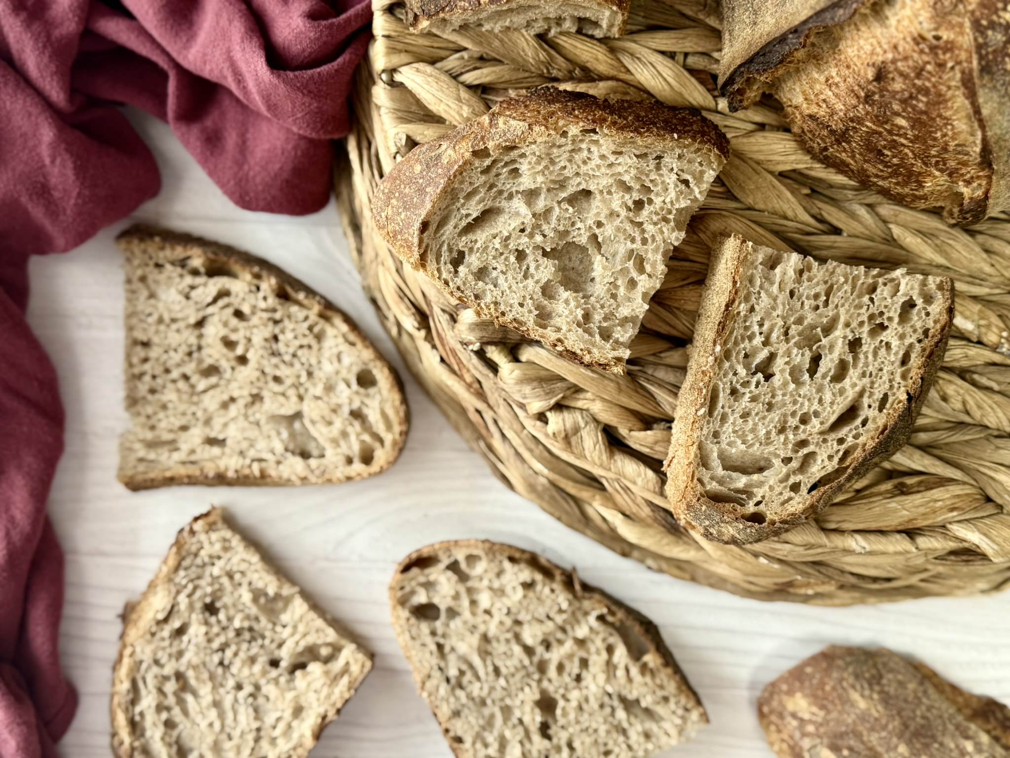 I like to keep my bread doughs hydrated enough to support strong gluten development, without tipping into overhydrated territory. That means aiming for a dough that feels soft and supple: not too wet, but not too dry. Since whole grains soak up more water, they can dry out the dough if there isn’t enough moisture to begin with. Taking all of that into account, the hydration of this dough rests around 84%. That number might look high on paper, but when you’re actually working with the dough, it feels just right. You can read more about dough hydration here.