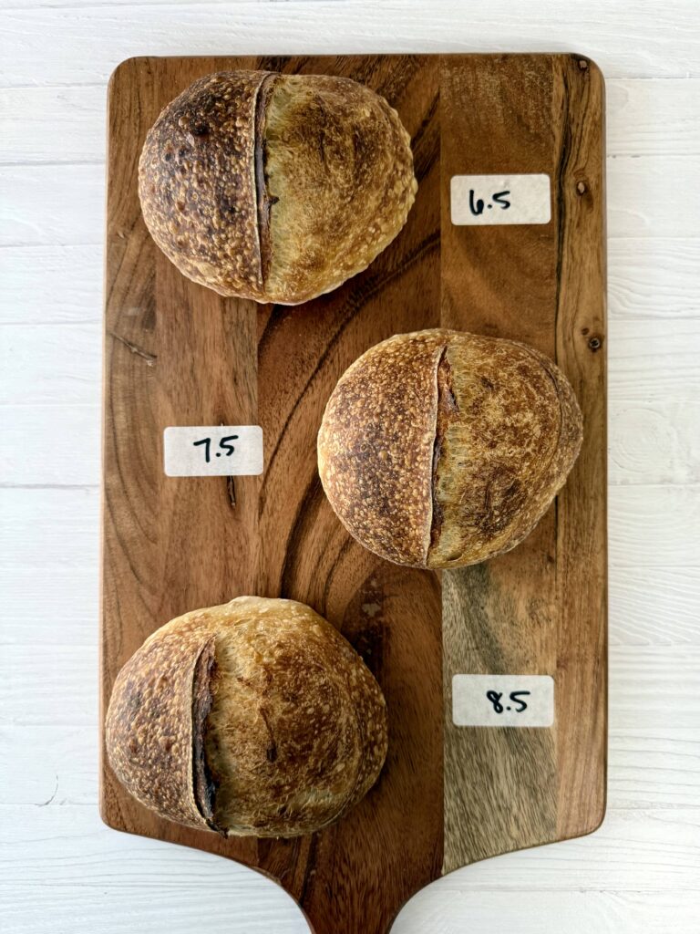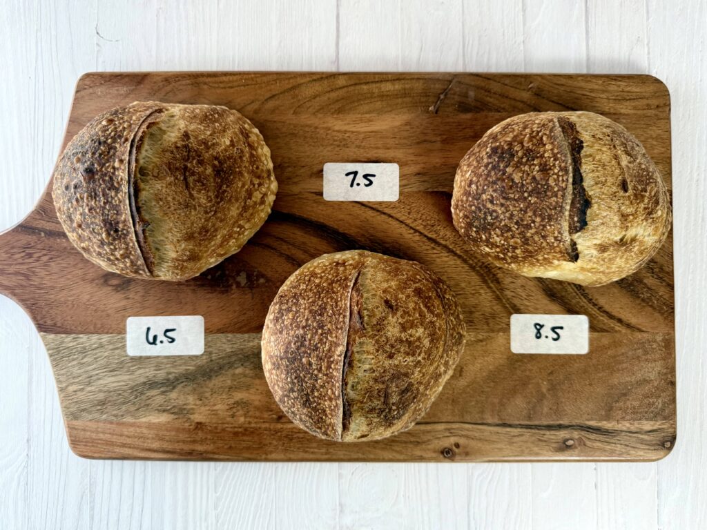This experiment is meant to show you the differences in a shorter versus a longer bulk fermentation, but all in the range for a quality fermentation. Here, I tested the difference between a 6.5, 7.5, and 8.5 hour bulk.